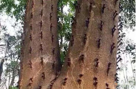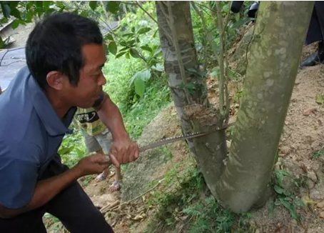 用砍傷法讓沉香樹快速結香的方法,是最常用的一種人工造香方法。砍傷法需要選擇6-8年以上胸徑10厘米以上的沉香樹,然后,在距離地面1.5米的地方,順砍數刀,刀與刀之間的距離約30-40厘米左右,傷口深約3-4厘米左右。